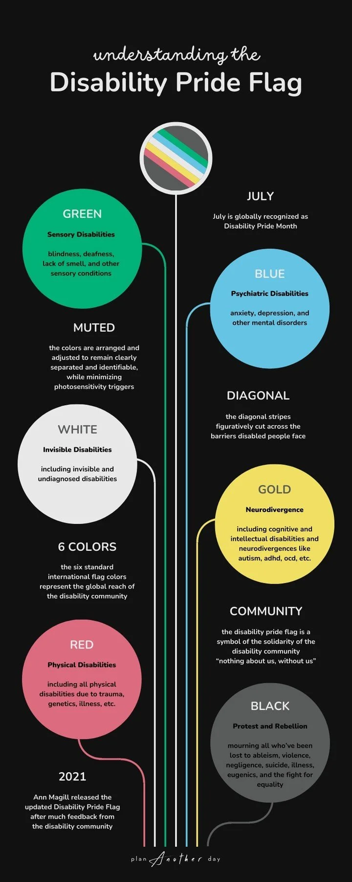 Before I get into the ableist language, I also wanted to share this infographic, created by a disabled artist, to explain the disability pride flag. A lot of people don't know we have one, or what the colors symbolize, so here is a great breakdown!